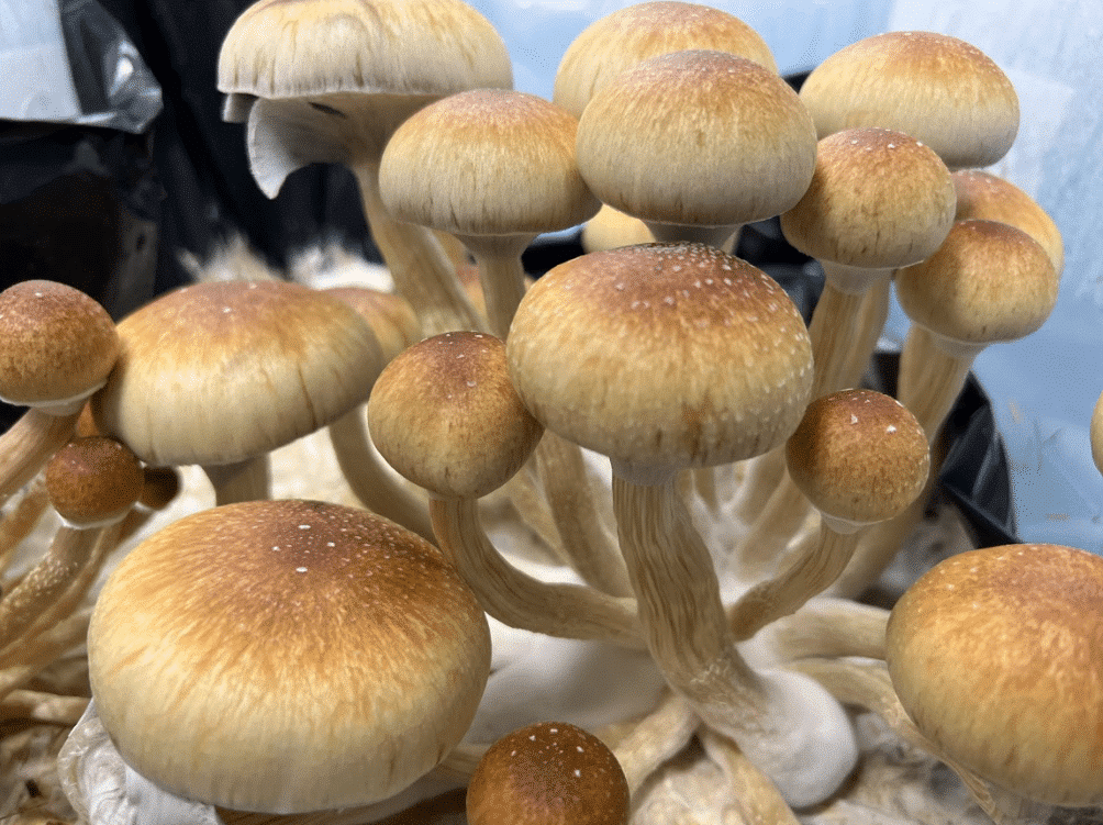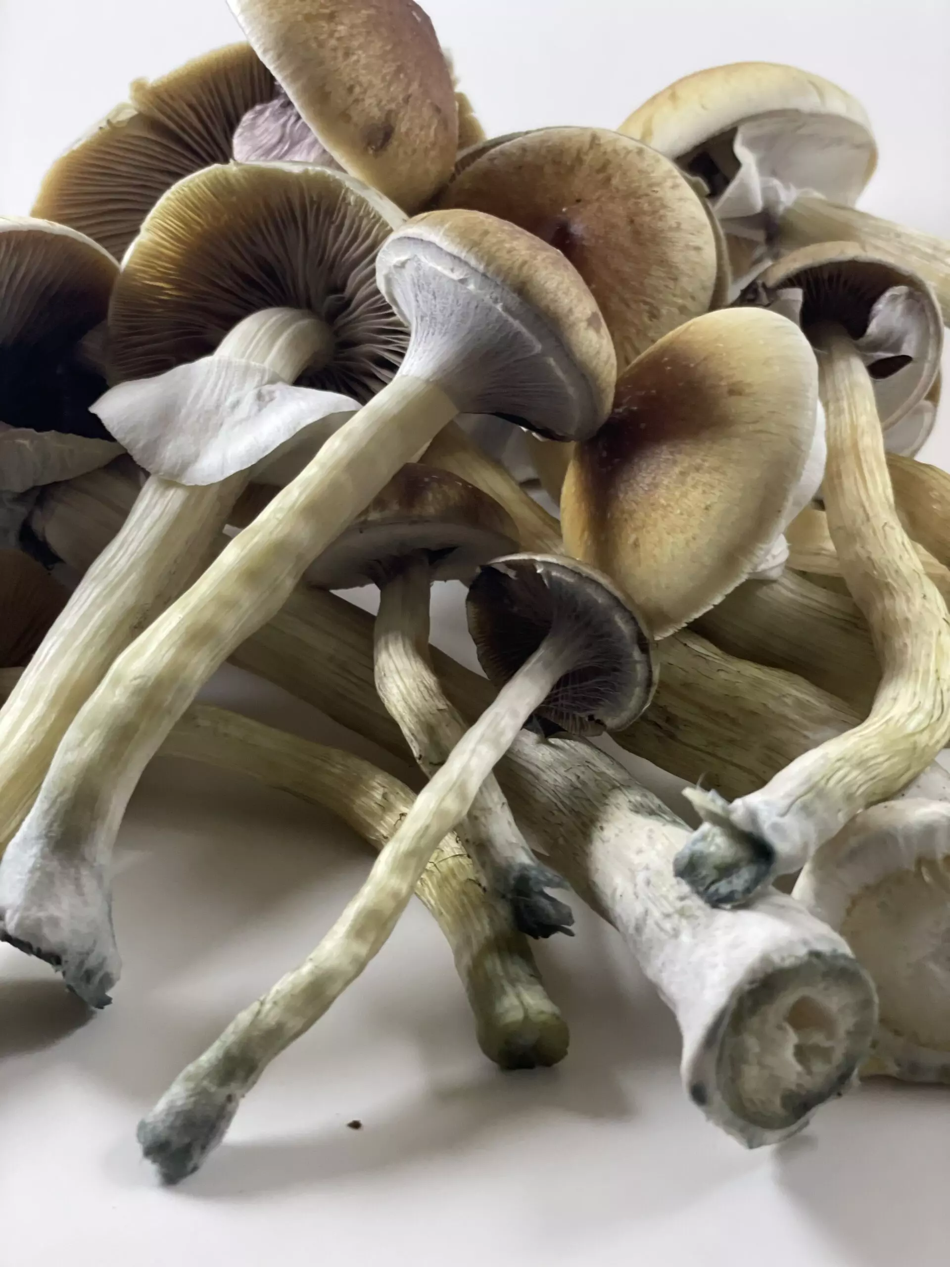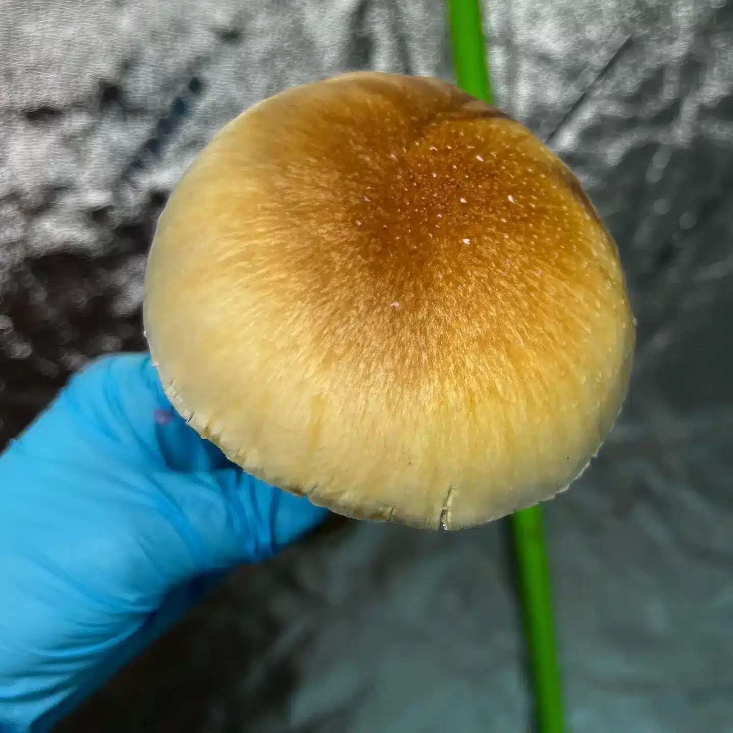 Very similar to Golden Teacher in appearance, Z-strain also has a larger golden cap and long stem, but they’re significantly smaller looking at them side by side. Z-Strain generally grows in beautiful bouquets of mushrooms and because of their psilocybin content bruise blue very easily.